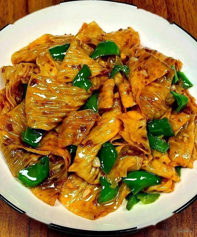 3. 加入泡软的豆皮,与青椒一起快速翻炒均匀
