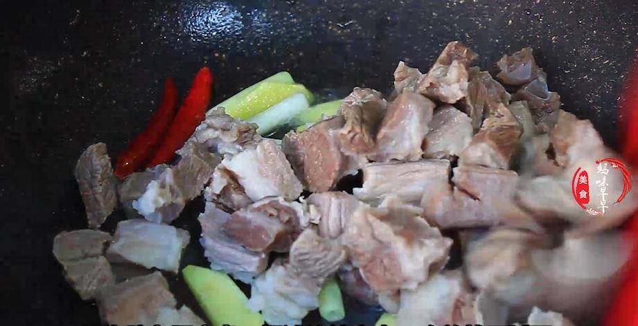4、锅里倒适量油,把葱段姜片干红辣椒爆香,然后倒入驴肉翻炒,因为肋条肥肉多,把油煸炒出来,吃着就不腻了,炒好后装盘备用。