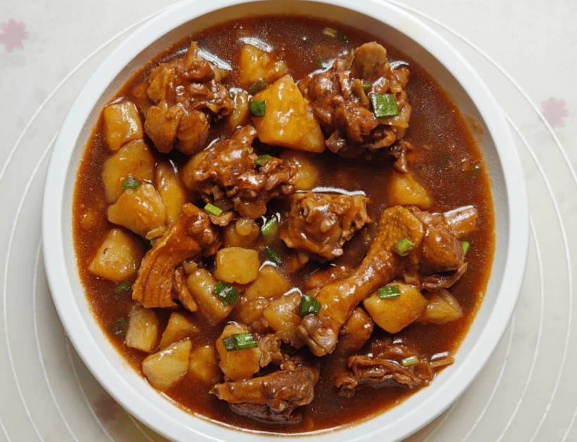 3、 起锅烧油,油热下八角、桂皮、香叶、花椒炒香,放入鸭肉炒干水份,淋入料酒炒香,加生抽、老抽、盐、白糖翻炒均匀,放入土豆,倒入啤酒没过食材,大火烧开,转中小火煮30分钟,开大火收汁,撒入葱花,关火出锅;