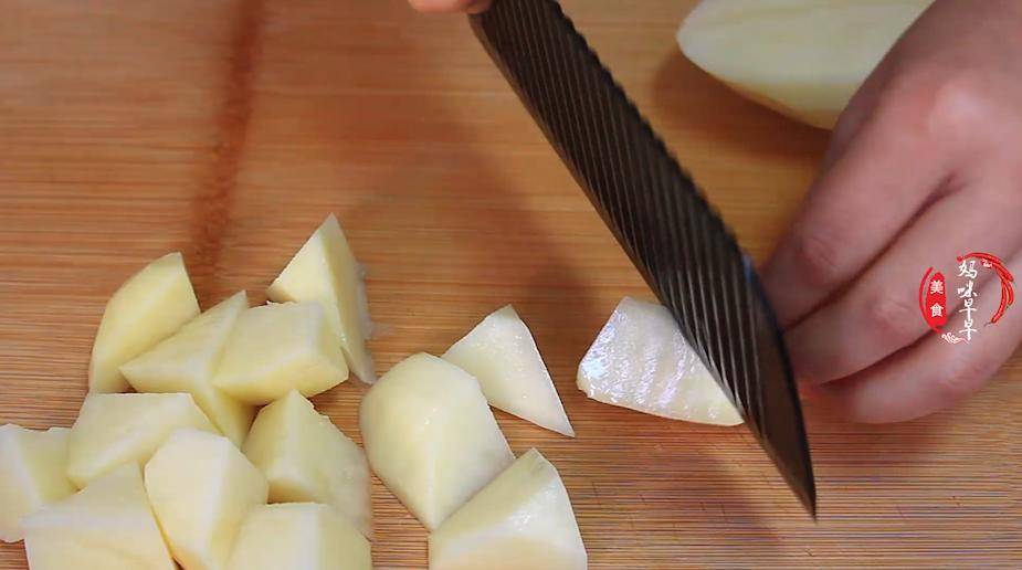 3、土豆去皮切成滚刀块备用,为了防止土豆氧化,将它放入清水里面浸泡。