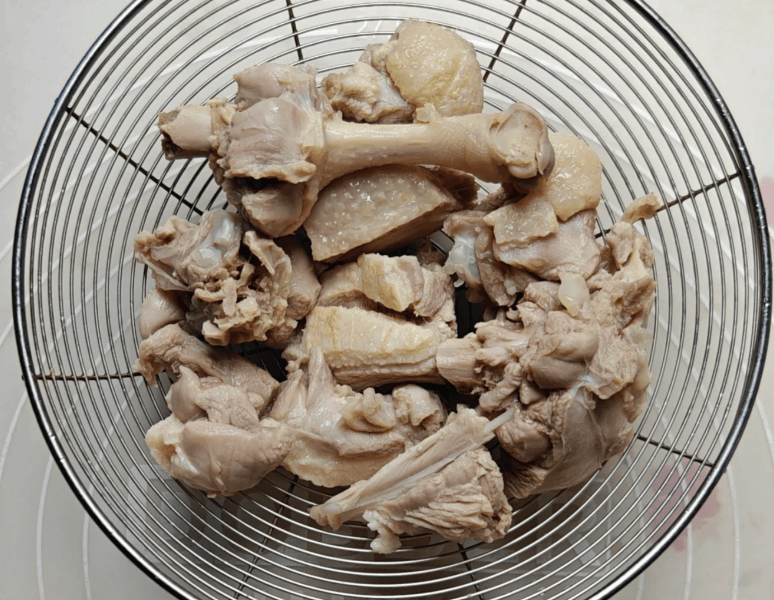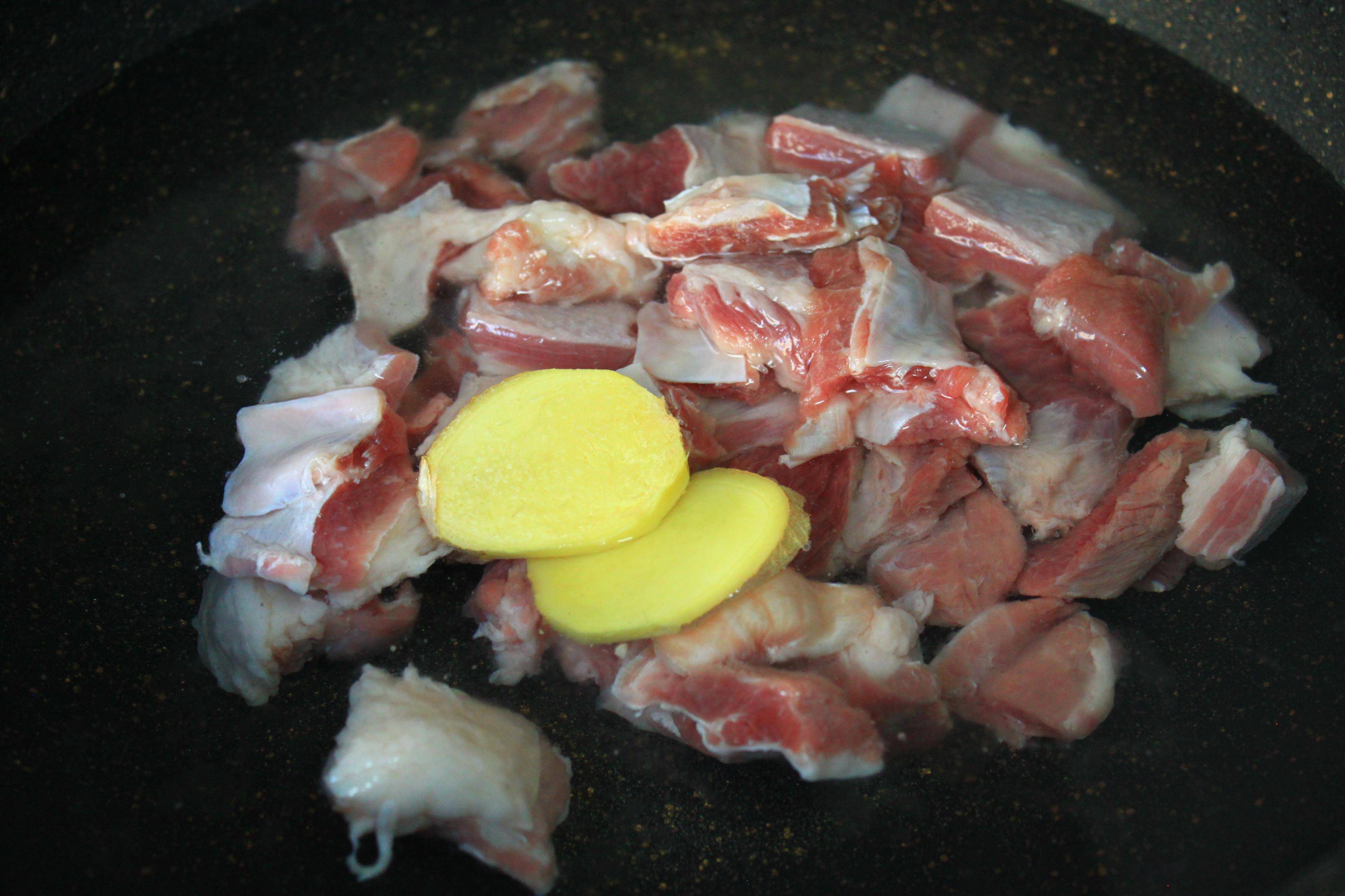 1,肋条用清水浸泡出血水,然后先切成条,再切成小块,切好的驴肉冷水下锅,加入几片姜,一点料酒去腥,大火烧开煮出血沫。驴肉焯好后捞出来,再冲洗一下。