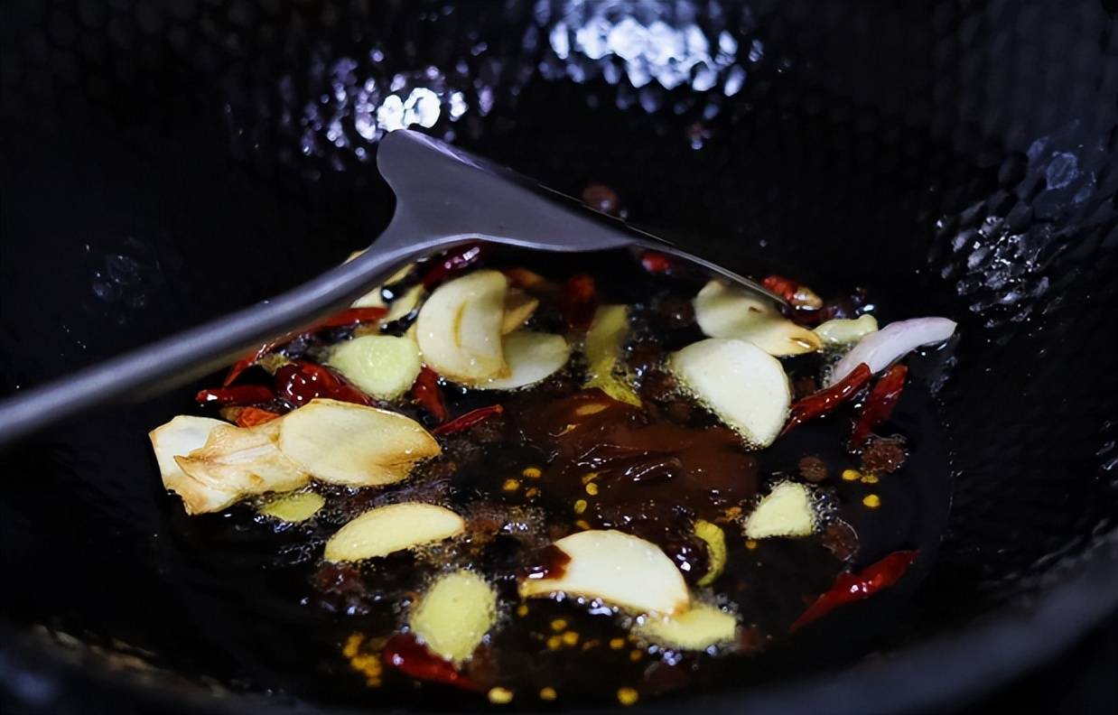 3、热油下蒜片姜片 炒香后下干辣椒段 ,然后放豆豉,来一勺甜面酱炒出香味。