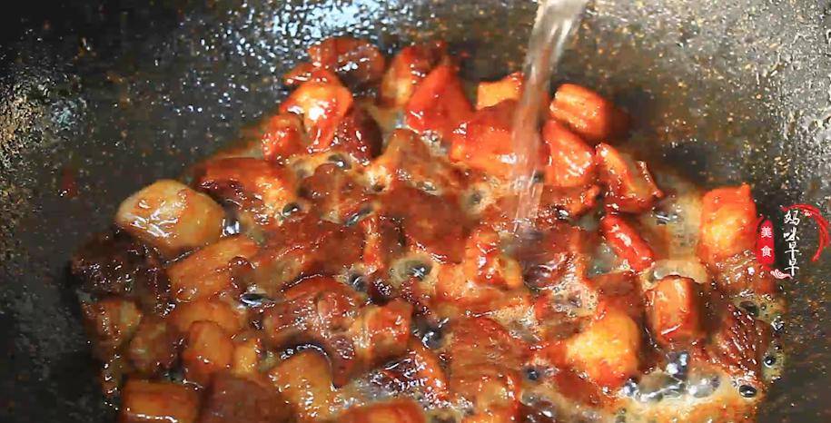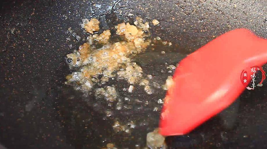 5,炒锅留油放入一些冰糖,炒一个糖色,小火慢炒,把冰糖融化,一直炒到枣红色时,就可以了,然后倒入驴肉快速翻炒上色。