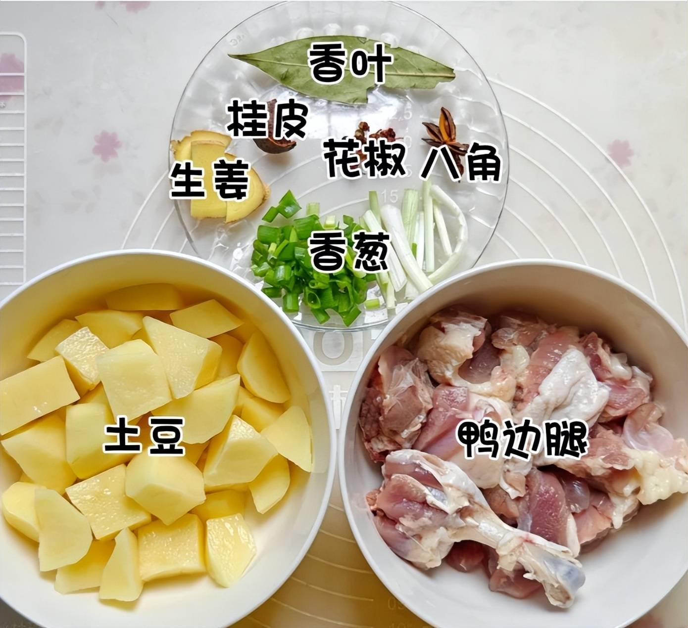 1、鸭边腿泡出血水,洗净切块;土豆去皮,洗净切块;香葱洗净,葱白切段,葱叶切葱花;生姜去皮洗净切片;八角、桂皮、香叶、花椒用清水冲洗干净,沥干水份;