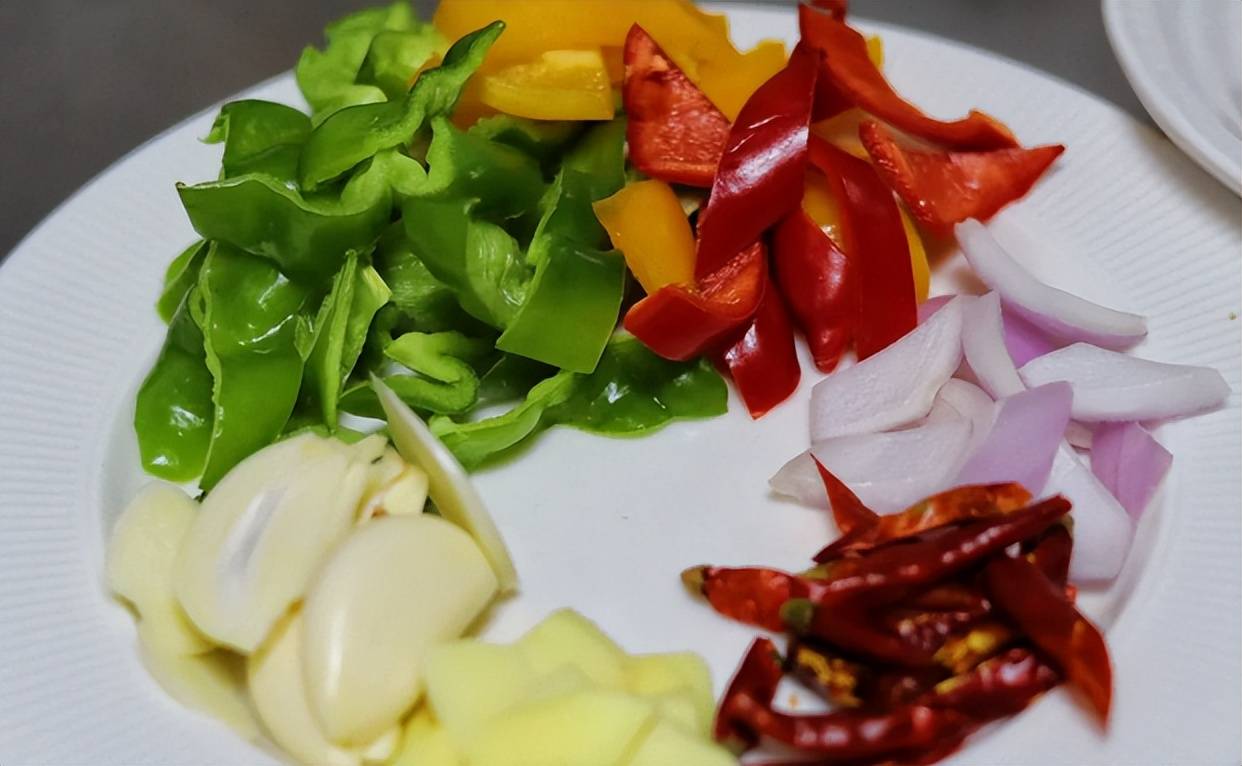 2、准备配菜,青红辣椒、干辣椒段 、洋葱、 蒜片姜片、 干豆豉备用。