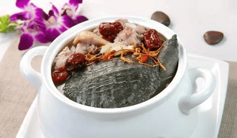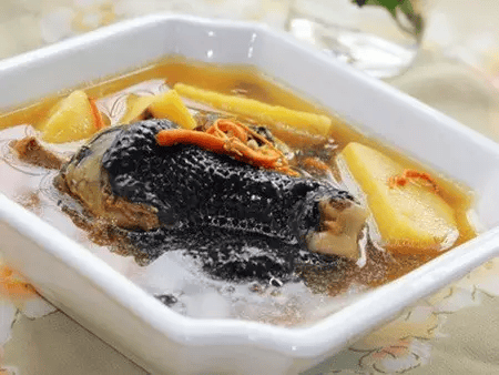 做法:将乌龟洗净切块,放沸水里氽透;捞出放锅内,加入冬虫夏草、火腿片、瘦猪肉,同时放入调料葱段、生姜片、黄酒、盐适量,盖好。用文火炖至肉烂,调入味精,即可食用。