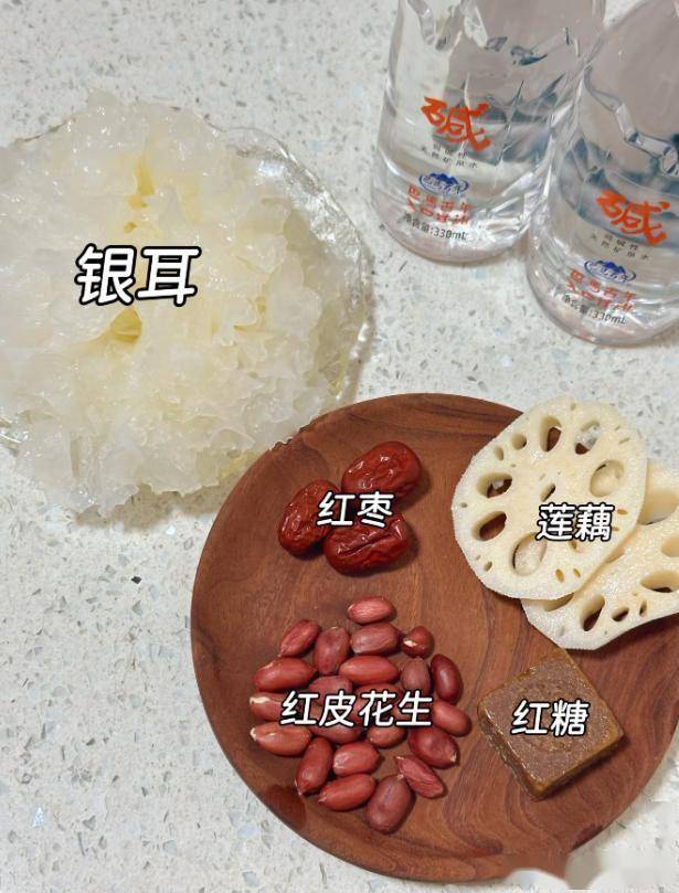 材料:一朵银耳,适量红枣,适量莲藕,一把花生,一块红糖。