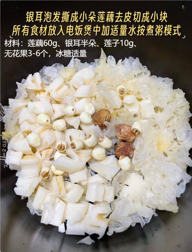 材料:莲藕60g,银耳半朵,莲子10g,无花果3-6个,冰糖适量。