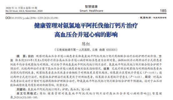 [1]健康管理对氨氯地平阿托伐他汀钙片治疗高血压合并冠心病的影响,陈红,智慧健康,2020-11-25