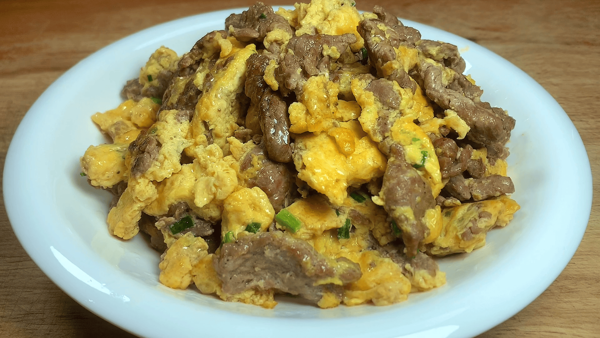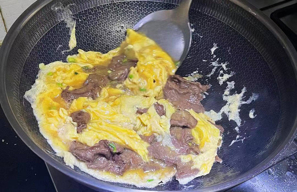 3、起锅放油,彻底烧热后先放牛肉,五六秒钟过去后再翻动,将其每一片都炒熟,接着把蛋液倒进去,裹到牛肉表面,继续炒,令其凝固,届时便可以出锅装盘。要比普通的炒牛肉更鲜嫩。