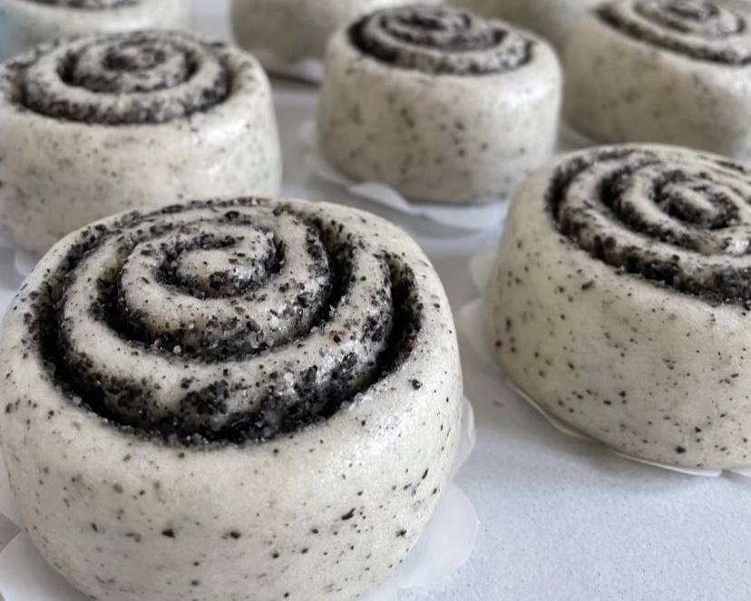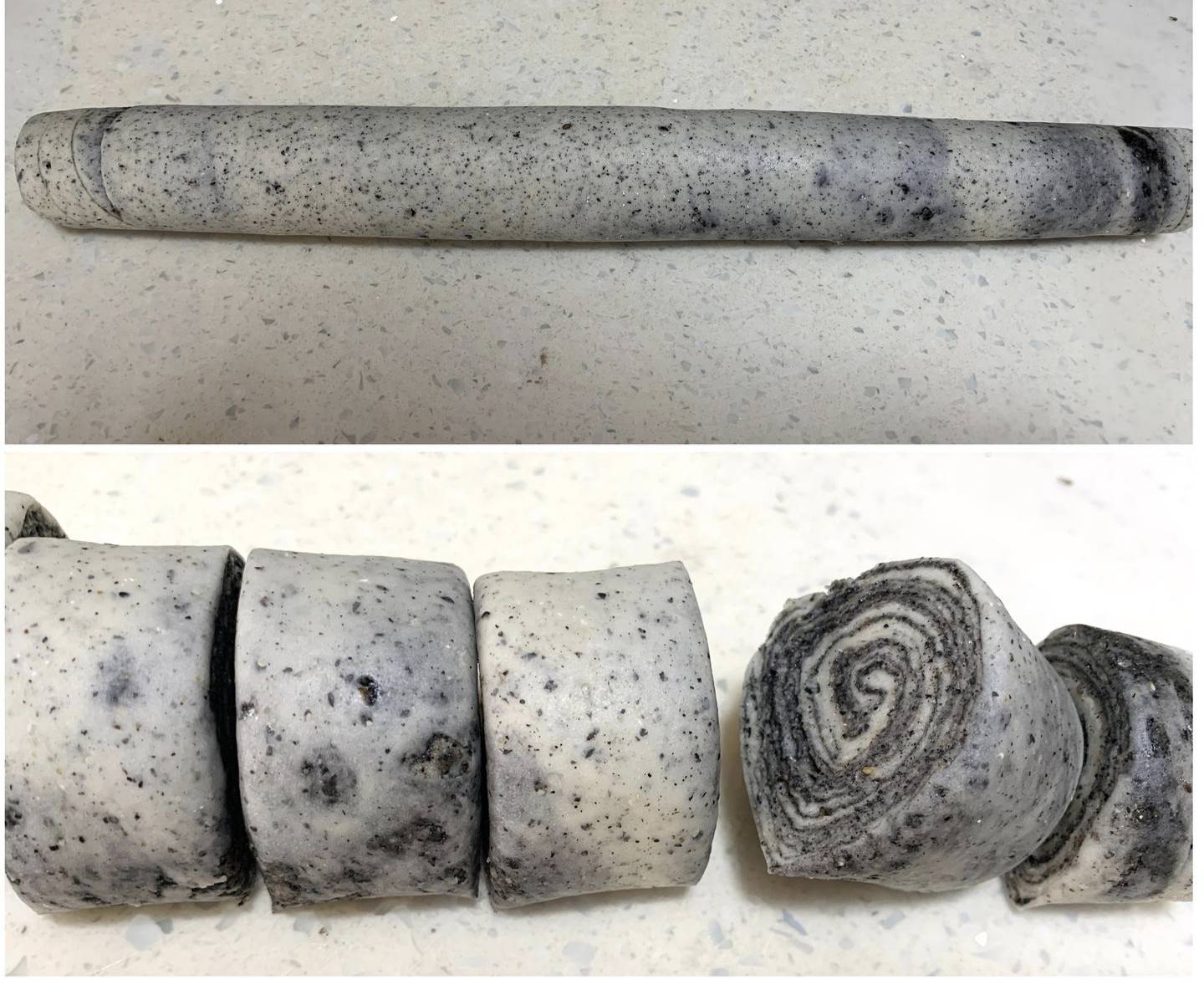 3、将其进一步揉一揉,擀成薄片,馅料在表面抹匀之后,就卷起来,切成长段。