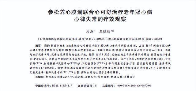 [1]周杰,参松养心胶囊联合心可舒治疗老年冠心病心律失常的疗效观察,宝鸡市陈仓医院心血管内科,2024-06