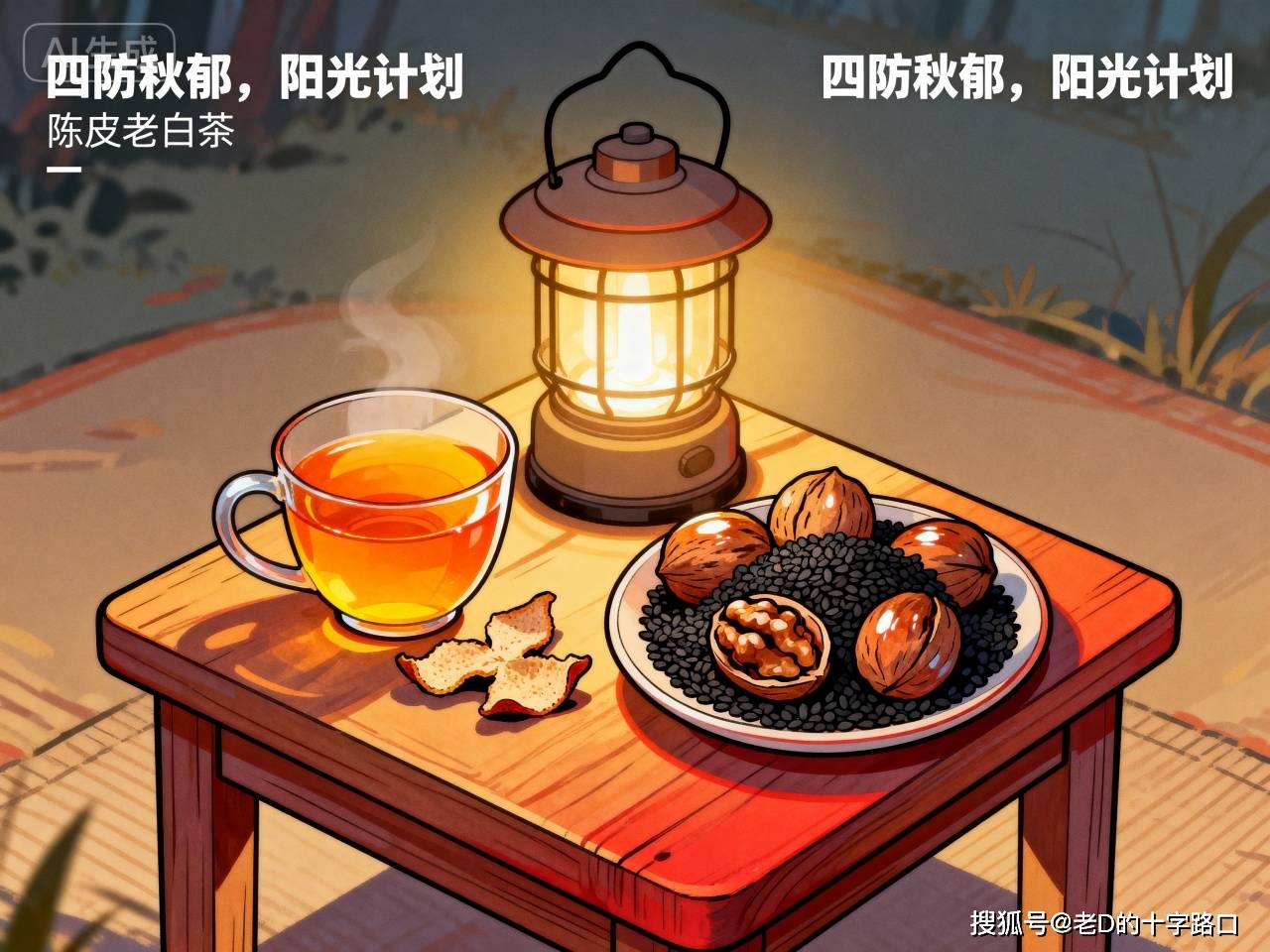 四防秋郁:光照减少引发“情绪降温”日照缩短使褪黑素分泌增加,约3%—5%人群会进入“亚抑郁”状态。制定“阳光计划”:晴天午时户外活动30分钟,阴雨天改用5000K暖光灯补光;饮食增加核桃、黑芝麻等富含色氨酸食材;社交方面,每周至少一次“茶叙”,以陈皮老白茶3克、老白茶5克同煮,既疏肝又暖脾。