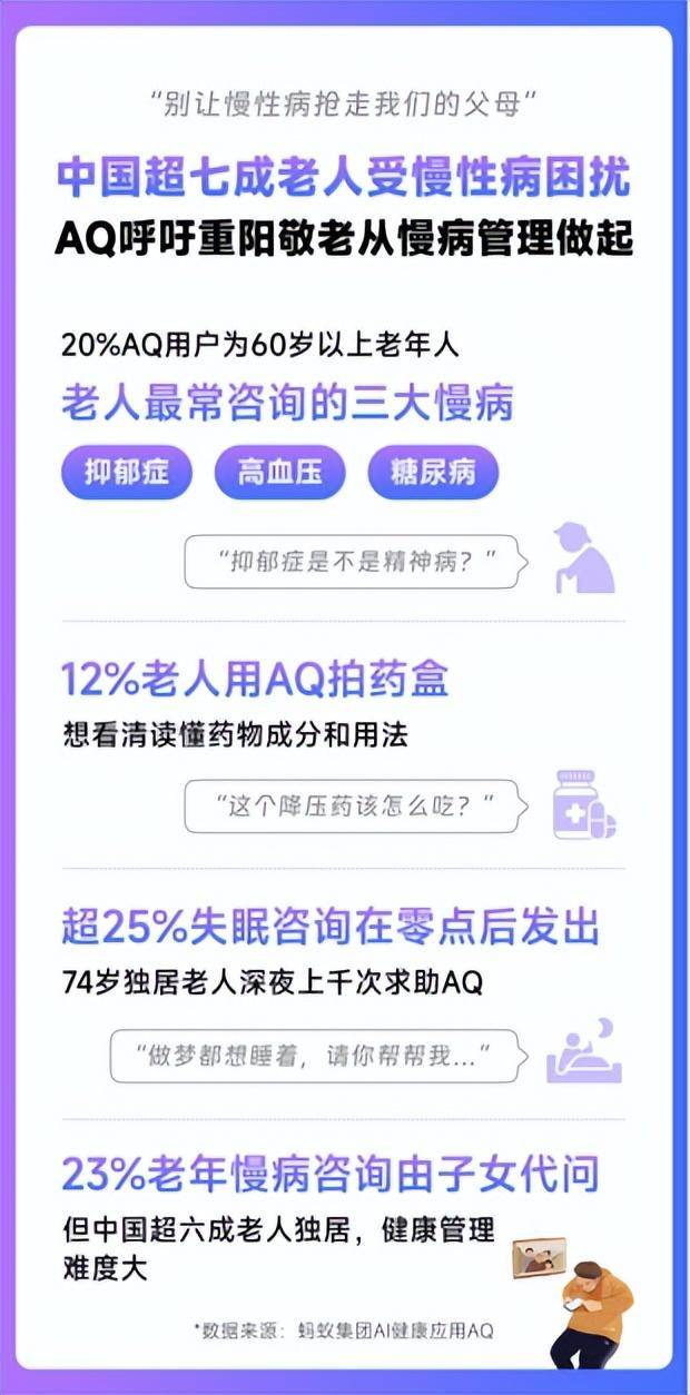 10月27日,蚂蚁集团AI健康应用AQ发起重阳节倡议《别让慢性病抢走我们的父母》,呼吁全社会将敬老爱老延伸至老年慢病管理这一健康问题,并推出AI拍血压血糖、家人健康风险预警、慢病用药定时提醒等5项产品新功能,帮助子女将说不出口的担心,变成真切的关心。