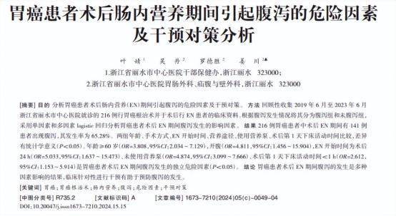 [1]叶婧.胃癌患者术后肠内营养期间引起腹泻的危险因素及干预对策分析,中国医药导报,2024-05-25