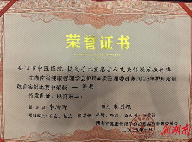 大众卫生报·新湖南客户端10月27日讯(通讯员 李璇 李瑜昕)近日,从湖南省健康管理学会护理品质管理专业委员会2025年护理质量改善案例竞赛现场传来喜讯,岳阳市中医医院选送的品管圈项目《提高手术室患者人文关怀规范执行率》,从全省67支参赛队伍中脱颖而出,荣获大赛一等奖。
