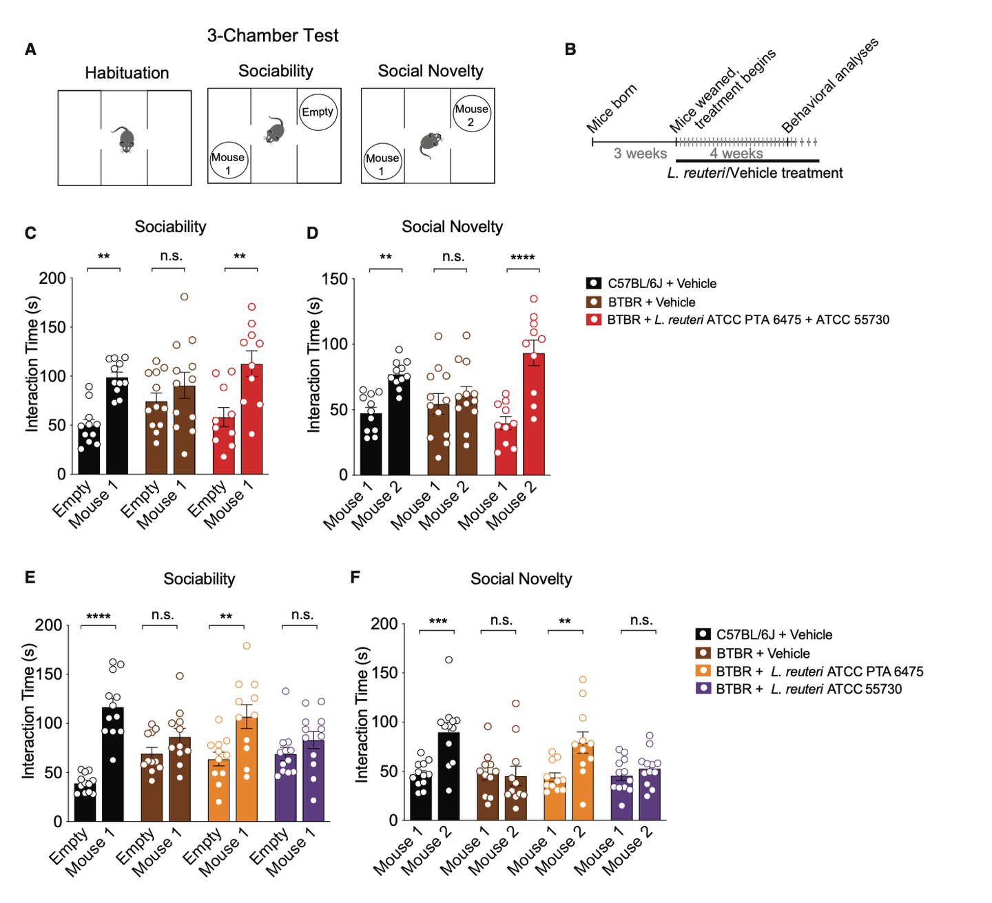 图3|不同 L. reuteri 菌株对小鼠社交行为的影响。(A)三箱社交行为测试示意;(B)给菌实验设计;(C–F)仅 ATCC PTA 6475 恢复 BTBR 小鼠的社交性与“新奇同伴偏好”,ATCC 55730 无效。
