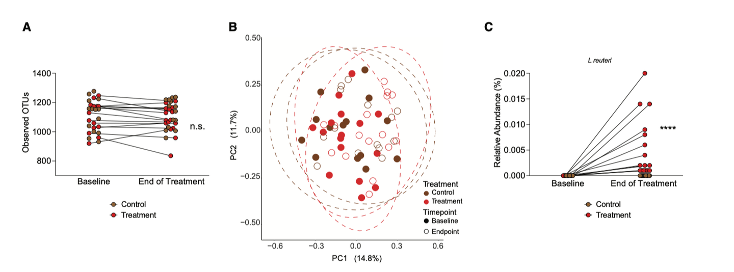 图2|对照组与干预组的宏基因组学特征。(A)α 多样性(观测到的 OTUs 数);(B)β 多样性(Bray–Curtis 距离的主坐标分析);(C)L. reuteri* 的相对丰度(仅在干预终点显著升高)。