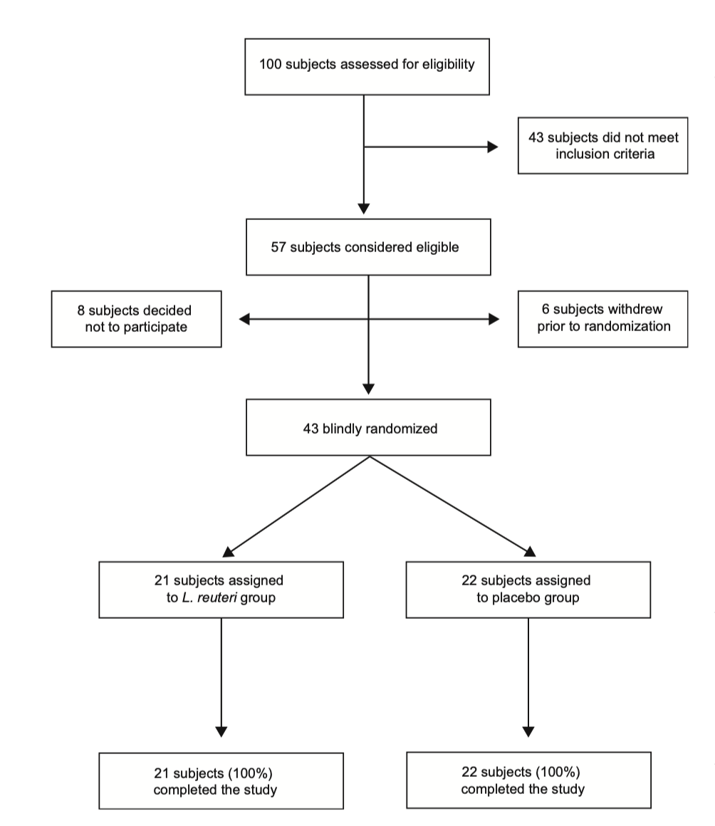 图1|孤独症儿童 L. reuteri 临床试验的 CONSORT 流程图。随机、双盲、安慰剂对照试验从筛查到完成的全过程;干预为 6 个月的精准细菌给药,与安慰剂比较。