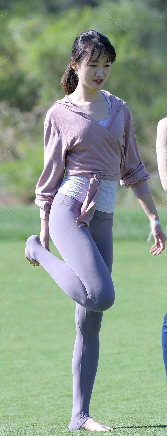 就像图中的小姐姐,用一套穿搭完美诠释了瑜伽裤的多面魅力。浅藕色的连帽上衣采用交叉系带设计,随意打个结便将腰线巧妙勾勒,内搭的浅灰背心若隐若现,增添了层次细节。而那条灰色瑜伽裤,更是整套造型的灵魂,高弹面料紧紧贴合腿部线条,却毫无束缚感,脚踩处的踩脚设计别致又实用,赤脚站在草坪上,既有运动的松弛感,又透着日常出街的精致感。这种运动风与时尚感的融合,打破了人们对瑜伽裤的刻板印象,让它在户外场景里也能成为吸睛焦点。