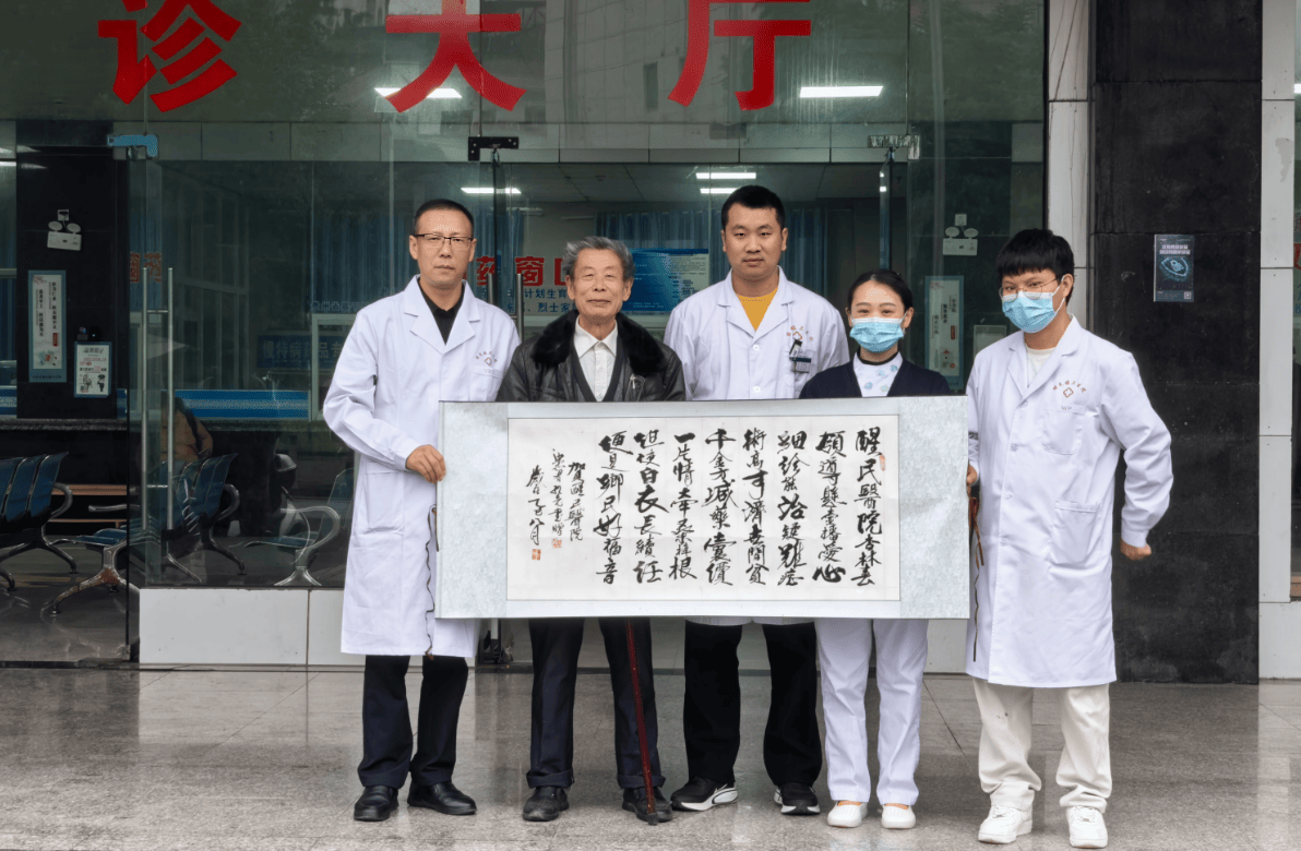 就在义诊热火朝天的同时,群众颜某先带着一幅精心准备的手写“打油诗”书法,专程来对袁汝银院长及单位进行感谢,他将这幅亲手写对医院感谢的“打油诗”书法郑重交到了袁院长的手中。