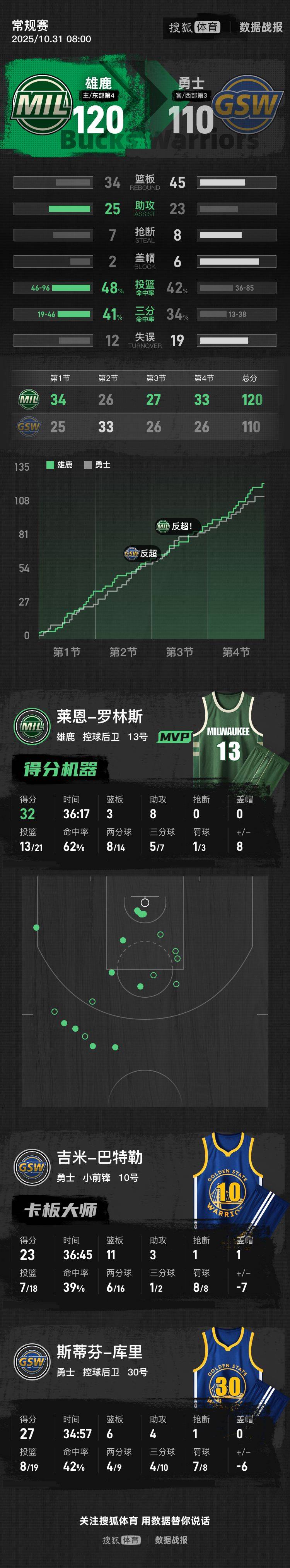 【搜狐体育战报】北京时间10月31日,2025-26赛季NBA常规赛继续进行,金州勇士客场挑战密尔沃基雄鹿。全场打完,勇士110-120爆冷不敌缺少字母哥的雄鹿。