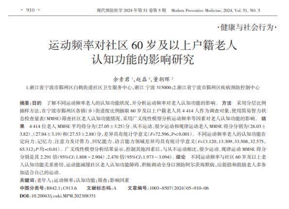 [1]余素君,赵磊,董朝晖.运动频率对社区60岁及以上户籍老人认知功能的影响研究[J].现代预防医学,2024,
