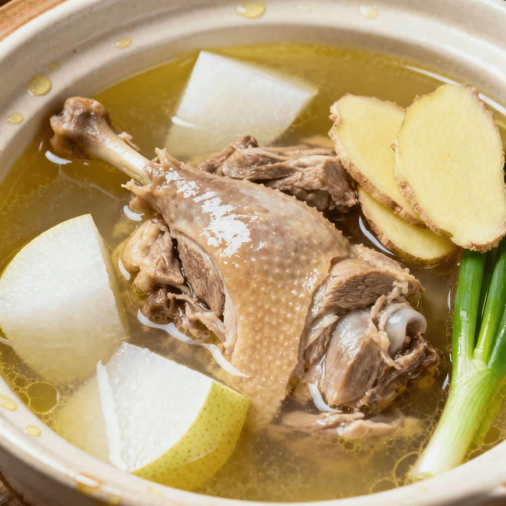 梨味甘、微酸,性寒,《调疾饮食辩》中提到其“冬至阳生,而后自梅为始,凡花多五出,阳数也;梨花独六出,其得阴气可知,故梨性寒。而艳阳天气,丽紫嫣红,争艳斗巧,而梨花独全白,其禀金气可知,故梨性肃清下行而降肺火。”鸭肉味甘、性凉,《名医别录》提到其“补虚除客热,和脏腑,利水道”。