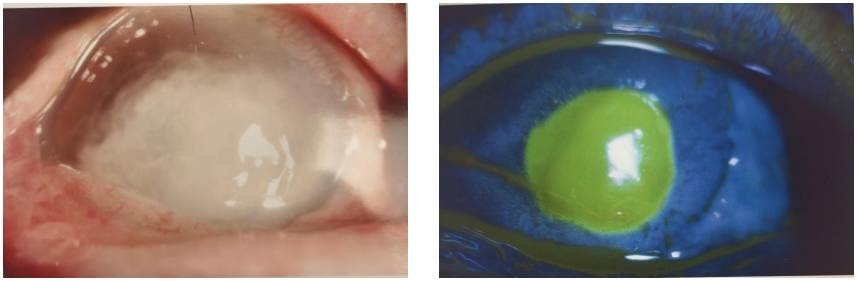 检查结果显示,姜阿姨左眼结膜充血严重,角膜上皮有一处约3*4mm的上皮脱落,且伴有脓性分泌物渗出;瞳孔呈圆形,但对光反射迟钝,晶状体也因眼部炎症无法清晰窥见。结合各项检查指标,姜阿姨被初步诊断为“左眼角膜溃疡”。