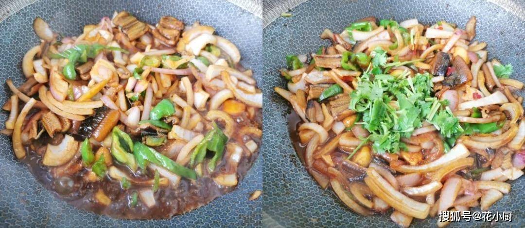 3、时间差不多到了,把洋葱丝和青椒丝放进锅里。接着翻炒,一直炒到洋葱丝和青椒丝断生。最后,把香菜撒在炒好的菜上。