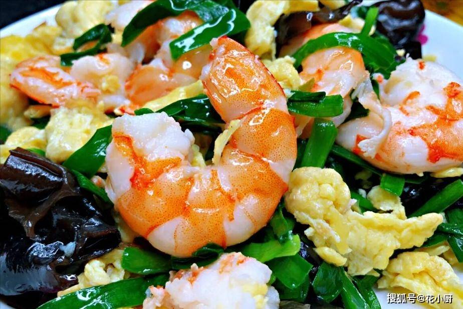 食材:大虾 10 只、鸡蛋 2 个、水发木耳适量、一小把韭菜、一勺食盐、一段葱、适量花生油