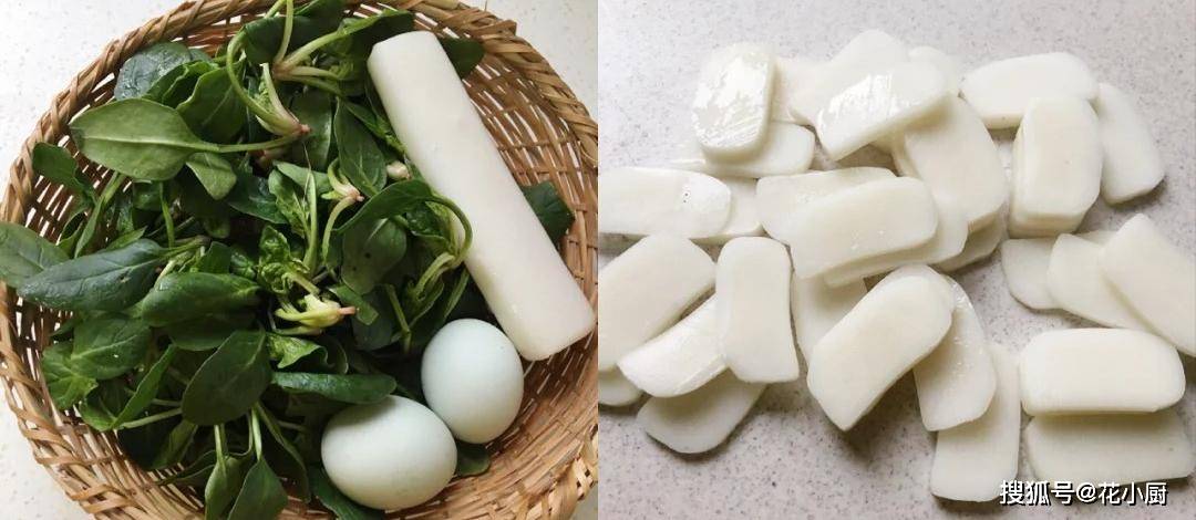 食材: 200 克菠菜、 2 个鸡蛋、一条年糕、盐 6 克、料酒半汤匙