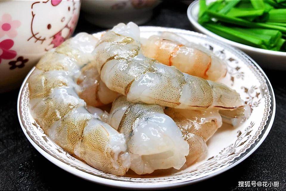 3、这时候烧一锅水,等水开得咕噜咕噜响,把虾放进去焯一下。焯到八成熟就行,别焯过头了,不然虾就老了,口感就不好了。焯完捞出来,放盘子里备用。