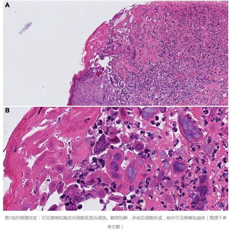 初起为红斑和丘疱疹,很快发展为集簇或散在的小水疱,2-4天后破溃形成糜烂或浅表溃疡,有烧灼感和疼痛。病程可持续2-3周。