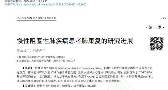 [1]郭灿灿. 慢性阻塞性肺疾病患者肺康复的研究进展 网络首发, 华西医学, 2024-06-21