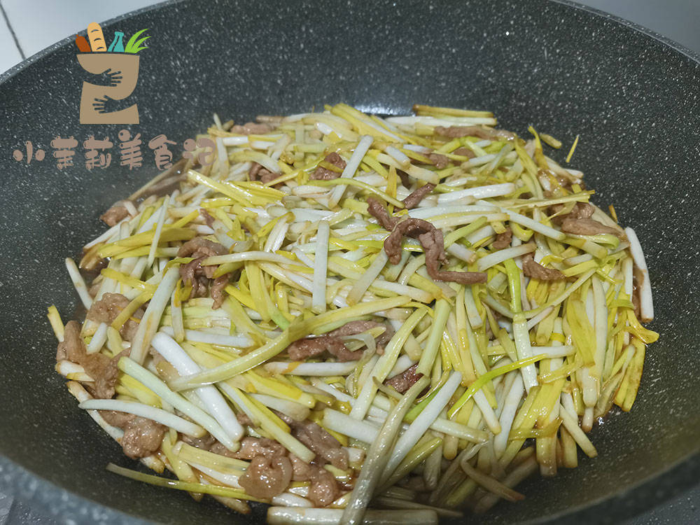 4、起锅放油,一定要充分热透以后,将肉倒里边,用铲子划拉几下,根根成型,这时候其实就熟了,蒜黄倒进去,扒拉几下,撒点盐,把味道炒匀马上盛出来。