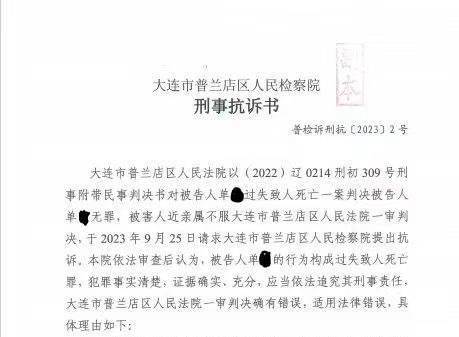 抗诉书称,被害人近亲属不服大连市普兰店区法院一审判决,于2023年9月25日请求普兰店区检察院提出抗诉。普兰店区检察院依法审查后认为,被告人单某的行为构成过失致人死亡罪,犯罪事实清楚,证据确实、充分,应当依法追究其刑事责任,普兰店区法院一审判决确有错误,适用法律错误。