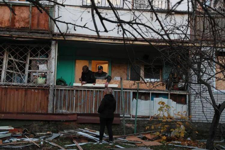 11月14日,在乌克兰首都基辅市第聂伯区,当地居民对遭受空袭损毁的房屋进行修缮加固。当天凌晨,基辅遭到俄军大规模空袭。新华社记者 李东旭 摄