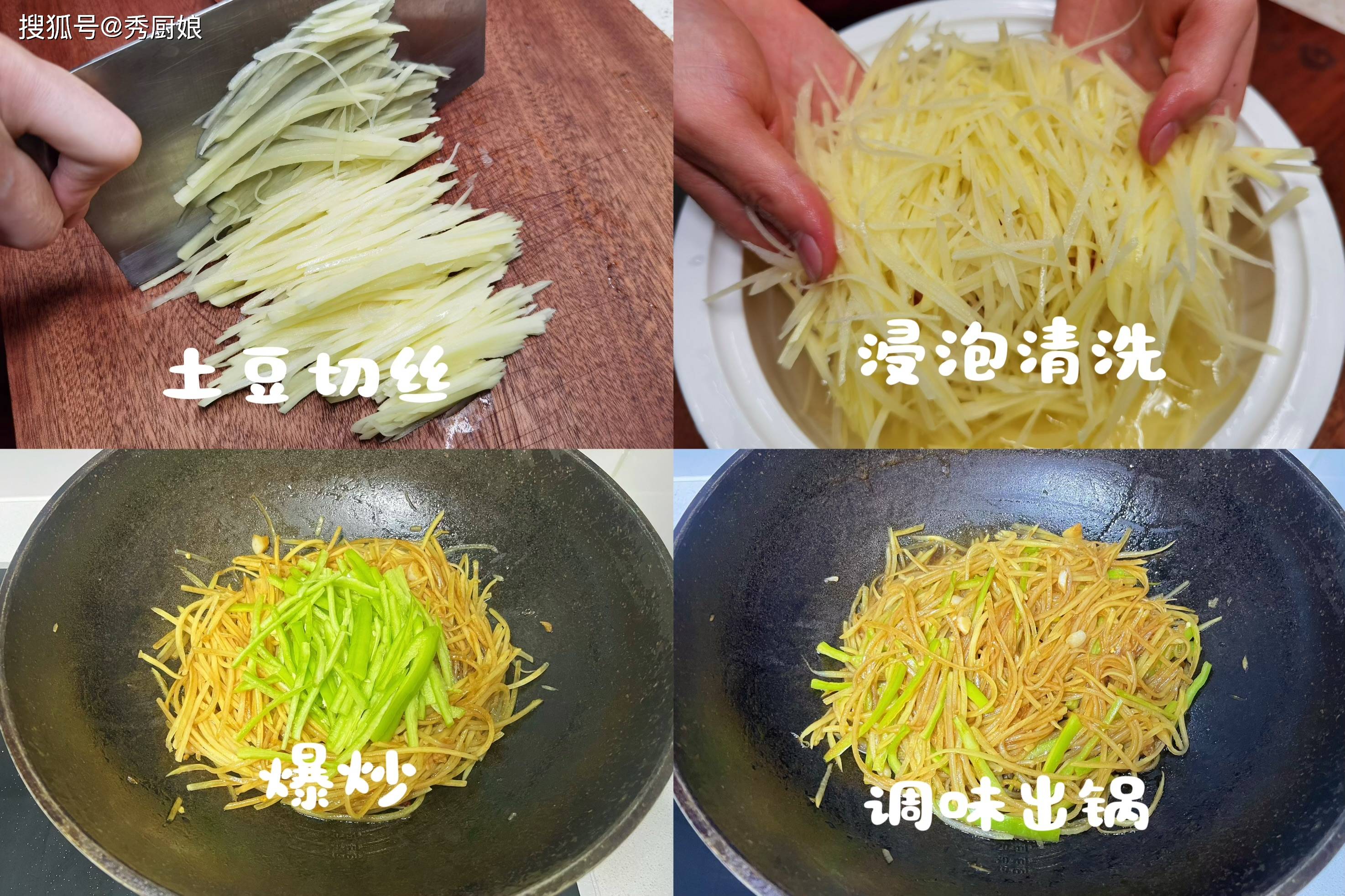 小贴士:整个炒制过程要快,大火急炒,从下锅到出锅最好不要超过2分钟,这样才能保证土豆丝的脆爽。
