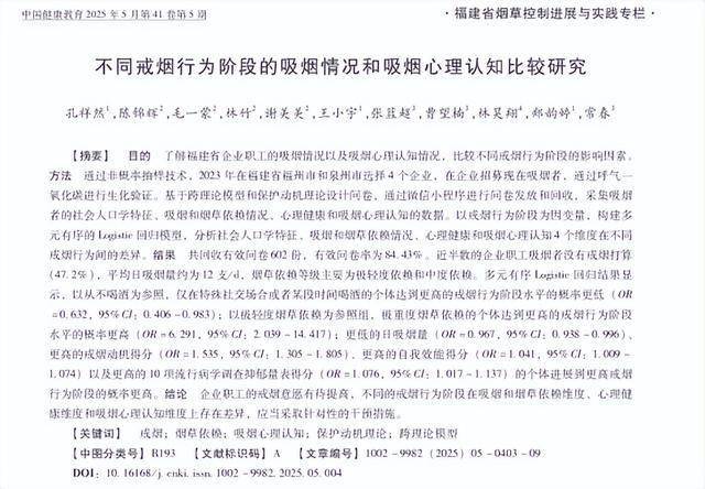 不同戒烟行为阶段的吸烟情况和吸烟心理认知比较研究,孔祥然,中国健康教育,2025-05-20
