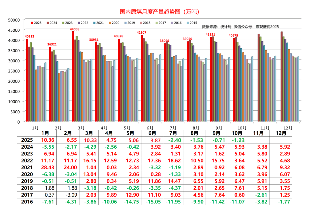 于是我们看到( 如下图),国内原煤产量连续四个月同比减产,2025年7-10月份,同比产量增幅分别为 -2.4%、 -1.53%、 -0.71%和 -1.23%。