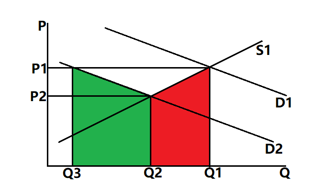 供需关系:供给S1与需求D2平衡,价格为P2,平衡需求量Q2,当涨价到P1时,平衡需求量会萎缩至Q3