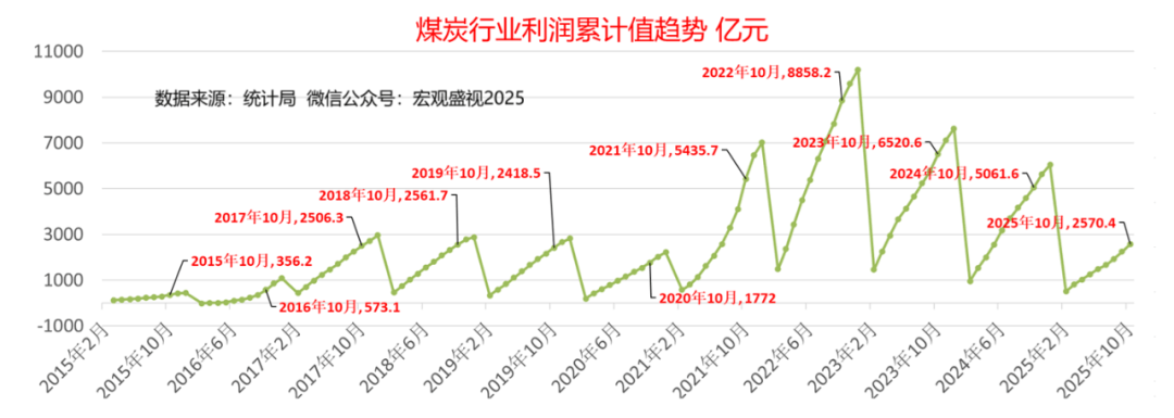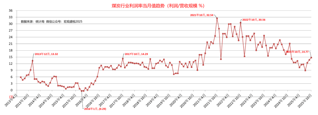 同一周期内,可以看到煤炭行业的利润水平( 如下图) ,的确得到了提升。2025年7月份,煤炭产业利润率触及阶段性底部8.95%后,连续三个月出现走高,分别为8月份12.41%、9月13.73%、10月份14.77%。