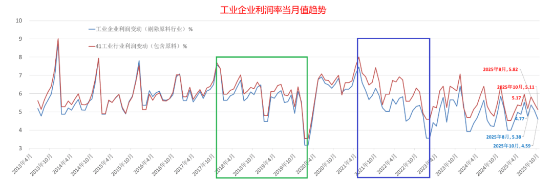 2025年9月份开始,中下游工业企业利润开始了回落,包含上游原料企业的 41个工业行业企业,9月份利润率回落到5.46%,10月份则进一步回落到5.11%; 不包含上游原料企业的工业行业企业,9月份利润率回落到5.08%,10月份则进一步回落到4.59%。