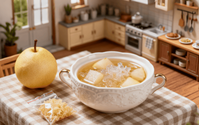 银耳泡发撕成小朵,加雪梨块、少量冰糖,炖30分钟。