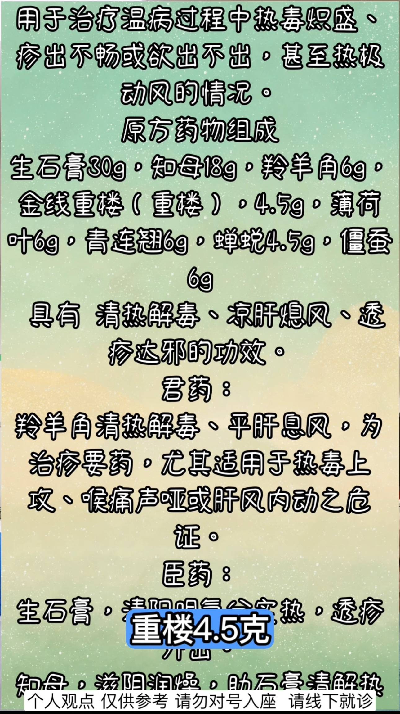 生石膏30g,知母18g,羚羊角6g,金线重楼(重楼),4.5g,薄荷叶6g,青连翘6g,蝉蜕4.5g,僵蚕6g