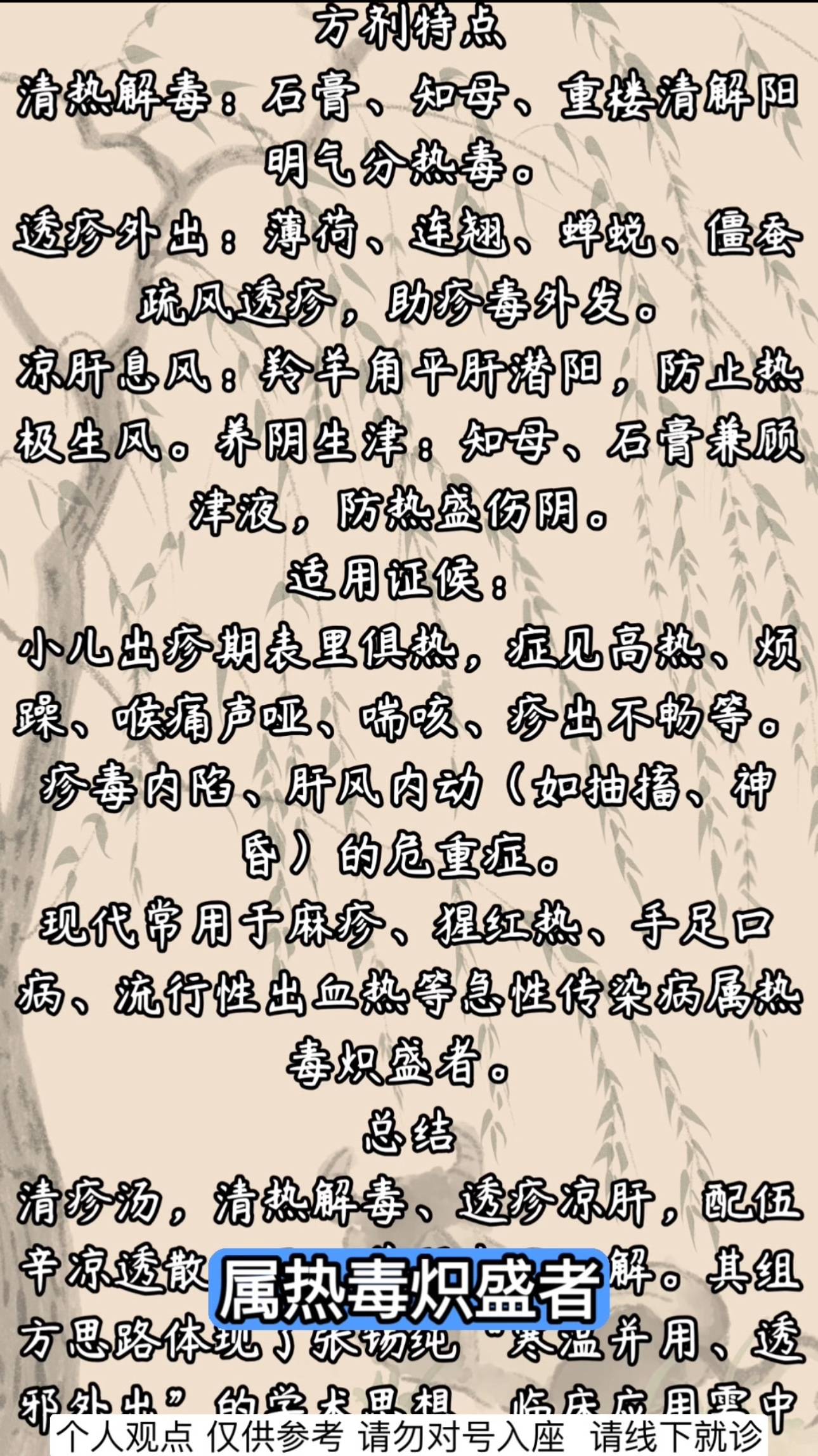 清疹汤出自张锡纯《医学衷中参西录》,主要用于治疗温病过程中热毒炽盛、疹出不畅或欲出不出,甚至热极动风的情况。