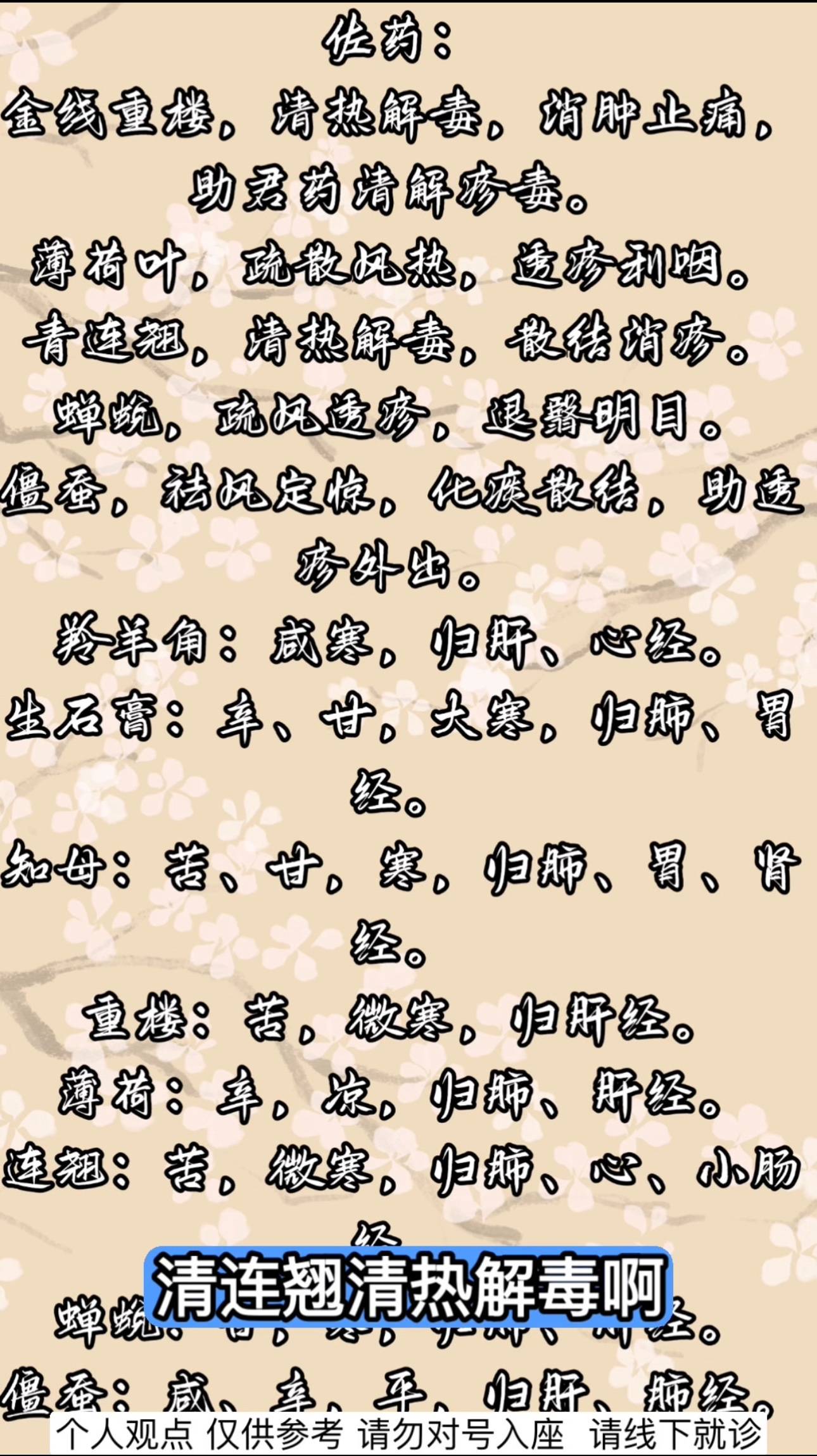 透疹外出:薄荷、连翘、蝉蜕、僵蚕疏风透疹,助疹毒外发。
