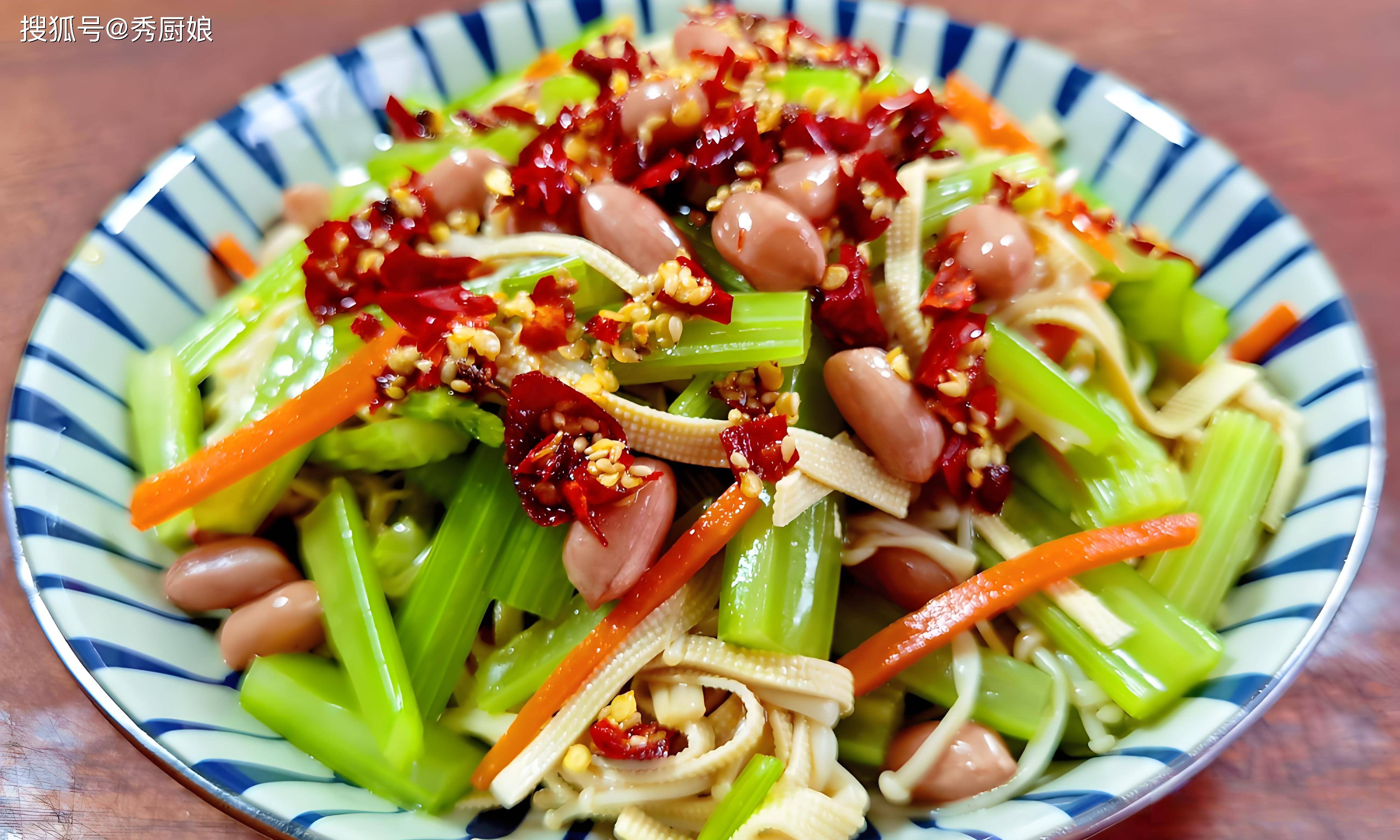 这道凉拌菜色彩丰富,口感层次分明——芹菜的脆、花生的糯、豆皮的韧、胡萝卜的甜交织在一起。五香花生增添了风味,免去了炒制的油腻。整道菜清爽开胃,降火不伤胃,适合作为晚餐的配菜,减轻肠胃负担,有助于安然入眠。
