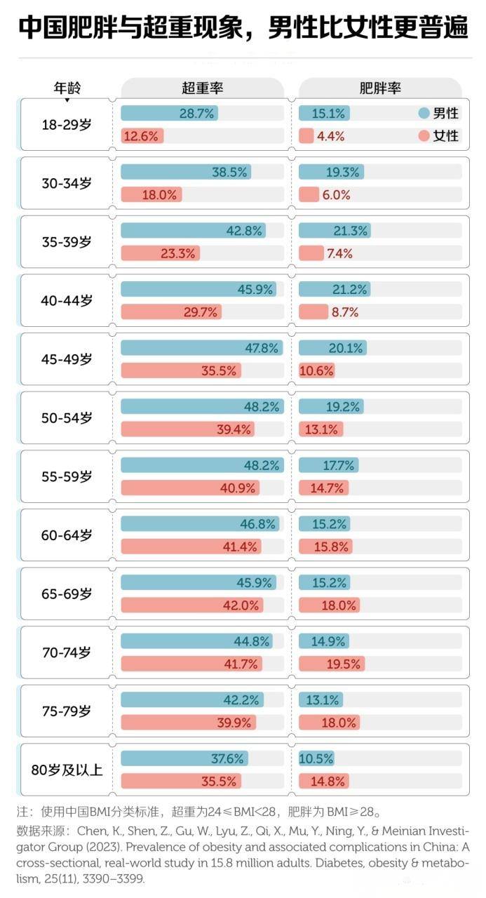 烧烤夜宵、酒局应酬、吸烟等都是男性常见的社交场景,再加上体重超标问题突出 ——2019 年男性超重 / 肥胖率分别为 41.1%/18.2%,远高于女性的 27.7%/9.4%,多重因素叠加让代谢风险持续上升。